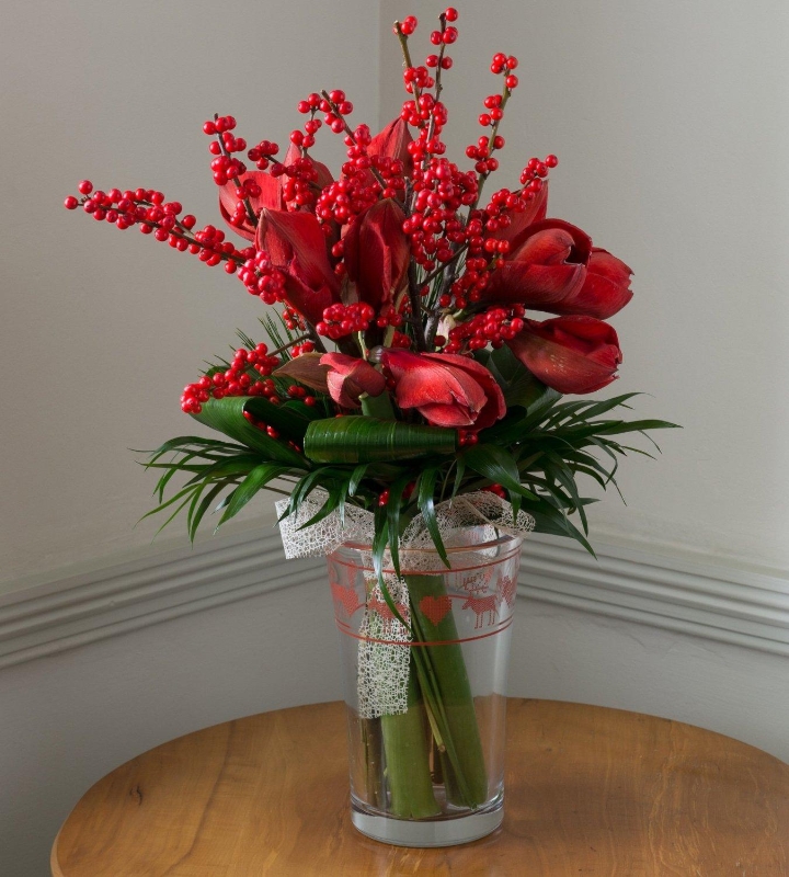 Traditional and full of festive warmth, this beautiful gift of red amaryliis and ilex berries is presented in a glass vase ready to be enjoyed.