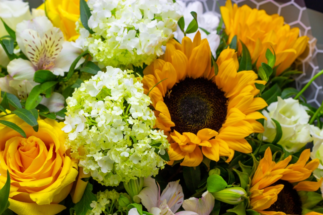 A beautiful bouquet featuring large golden sunflowers, white hydrangeas, soft yellow roses, and seasonal flowers. The flowers are complemented by green foliage with a nice mix of textures and bright, cheerful colors to create a warm and uplifting bouquet for your someone special.