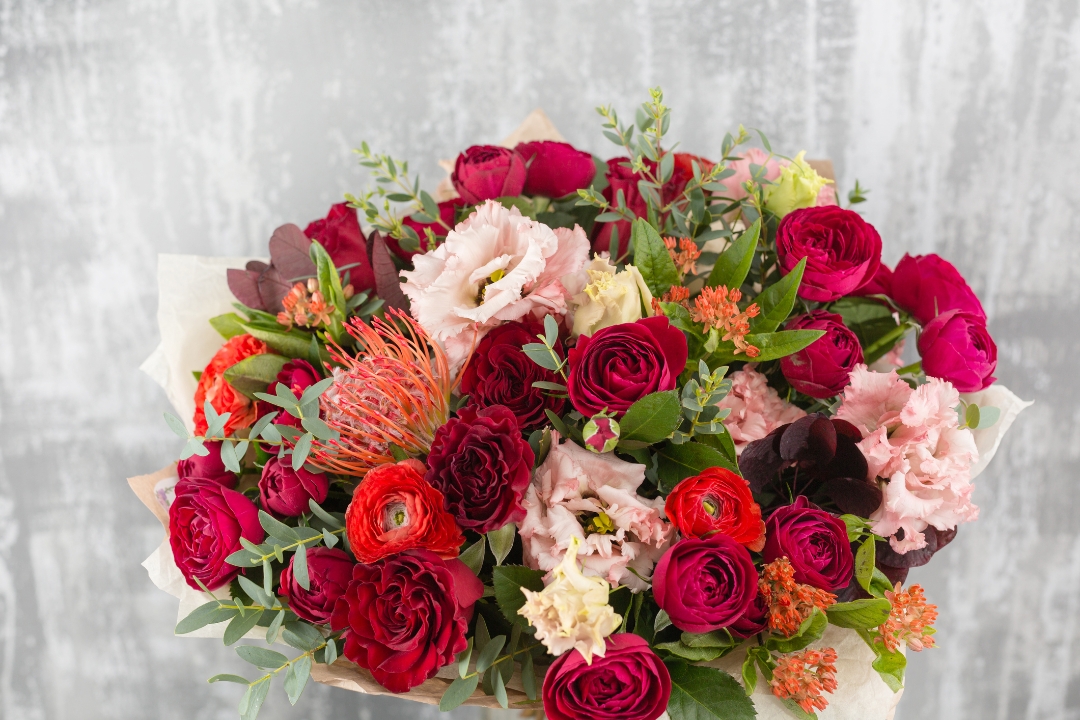 Striking reds and subtle tones of orange and pale pink, a really beautiful flower bouquet.