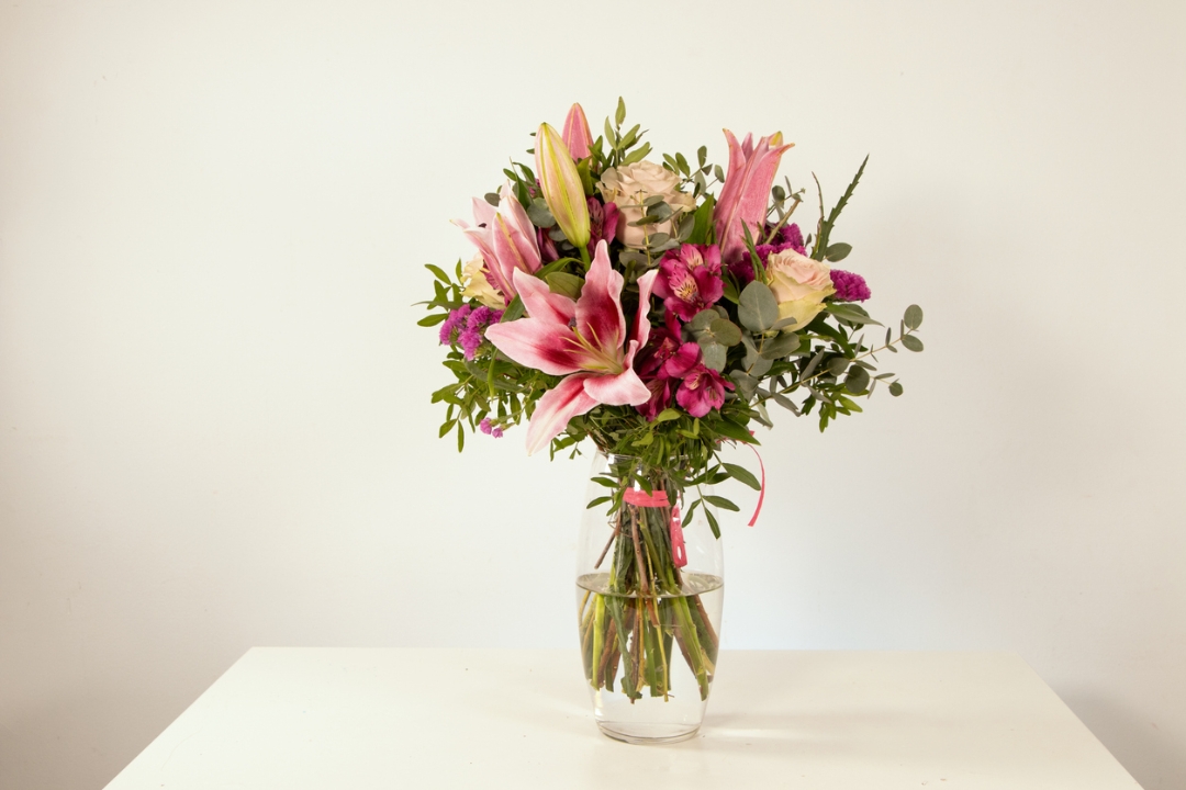 A classic selection of flowers designed to impress, Our Lily Bouquet combines soft romance with vibrant charm. Featuring stunning pink lilies, delicate cream roses, and alstroemeria, this hand-tied bouquet is beautifully balanced with fresh greenery and subtle pink and purple accents.